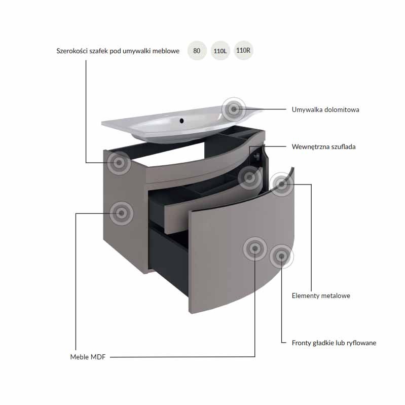 Vena Arte 2.0 to pokrewna kolekcja Vena 2.0, wyróżniająca się innowacyjną szufladą ukrytą za jednym frontem, zapewniającą dodatkową funkcjonalność, ale także estetyczny, minimalistyczny wygląd. Nowym elementem są ryflowane fronty, które nadają meblom dynamicznego, ale zarazem subtelnego charakteru. Zaokrąglone kształty oraz zintegrowana umywalka tworzą harmonijną, jednolitą powierzchnię. Kolekcja oferuje szeroki wybór rozmiarów szafek, umożliwiając idealne dopasowanie do przestrzeni łazienki. Zastosowane materiały, takie jak MDF i umywalki dolomitowe, zapewniają trwałość i łatwość w utrzymaniu. Kolorystyka obejmuje odcienie od stonowanego beżu po elegancki antracyt