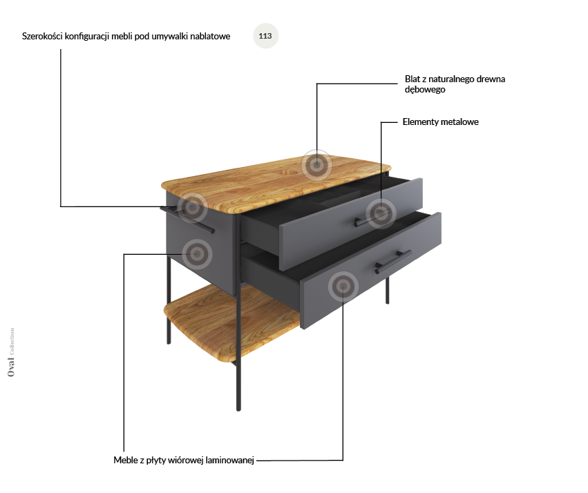Oval pozwala na dostosowanie mebli do różnych stylów i wielkości łazienek. Kolekcja to idealna propozycja dla tych, którzy szukają prostych, ale eleganckich rozwiązań do swojej łazienki, łącząc nowoczesność z przytulnym klimatem.