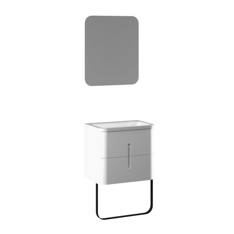 Zestaw mebli łazienkowych w skład którego wchodzą: szafka pod umywalkę z dopasowana umywalka bez otworu na baterię w dekorze White, lustro oraz płozę do szafki pod umywalkę meblową z dwiema szufladami.