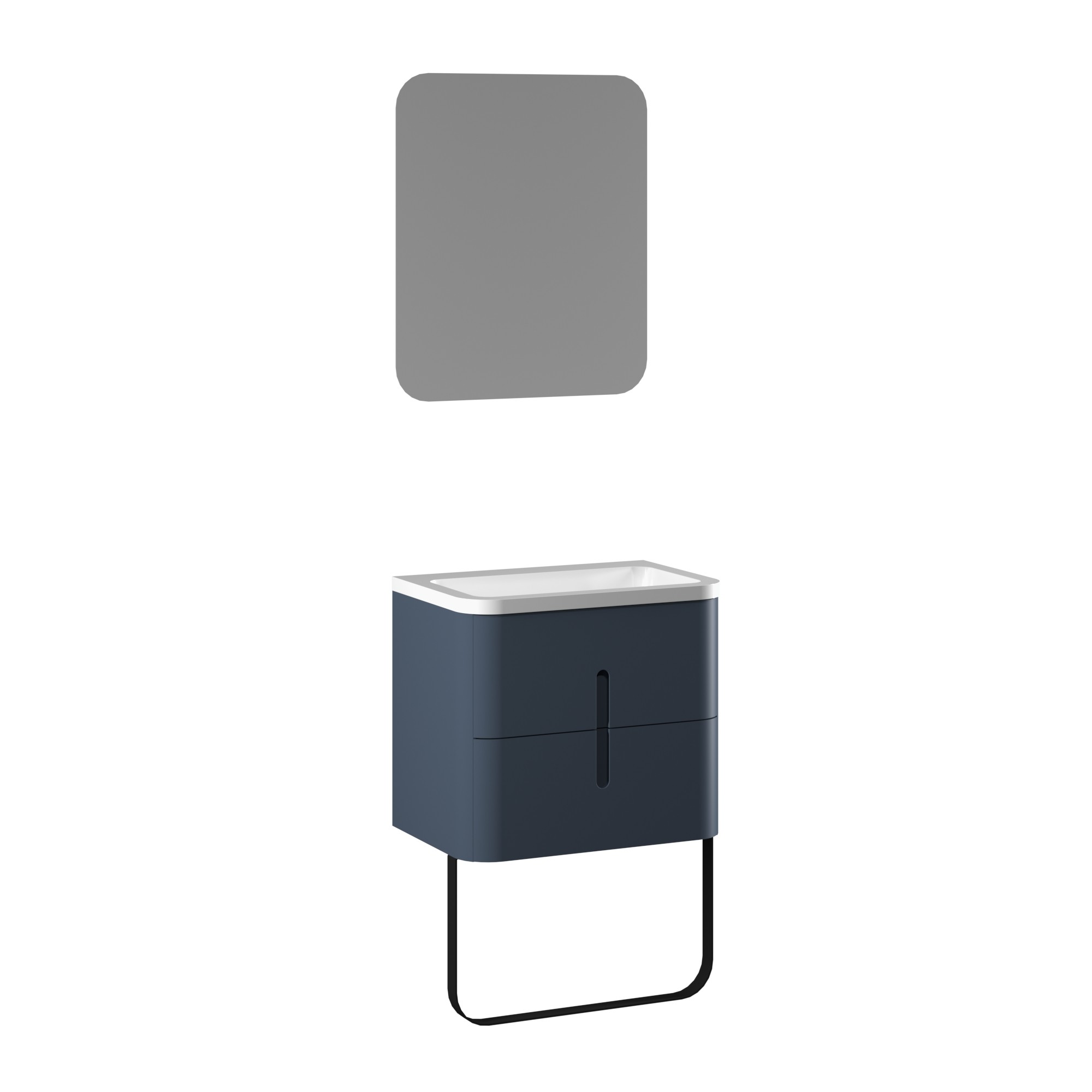 Zestaw mebli łazienkowych w skład którego wchodzą: szafka pod umywalkę z dopasowana umywalka bez otworu na baterię w dekorze White, lustro oraz płozę do szafki pod umywalkę meblową z dwiema szufladami.